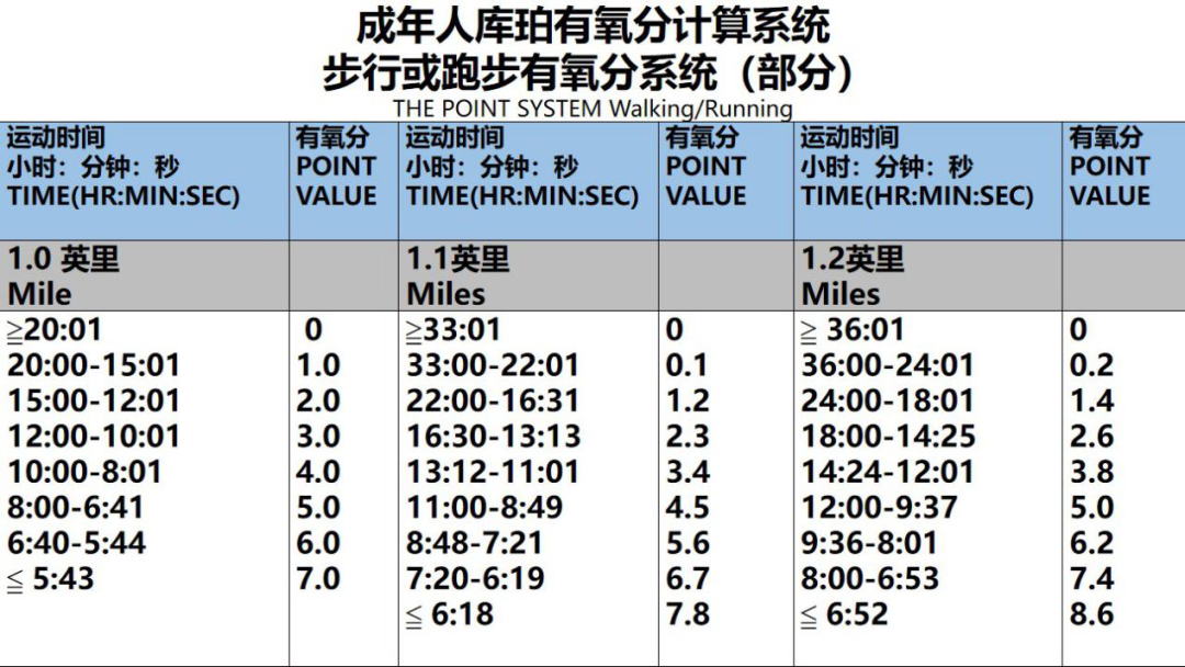 ★例如:步行,18分钟完成一英里,得1 个有氧分;