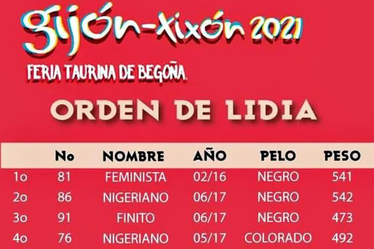 斗牛演出的海报上写着今日斗牛士的名字,被他杀死的两头公牛的名字也赫然在目:女权主义者(Feminista)和尼日利亚人(Nigeriano)。