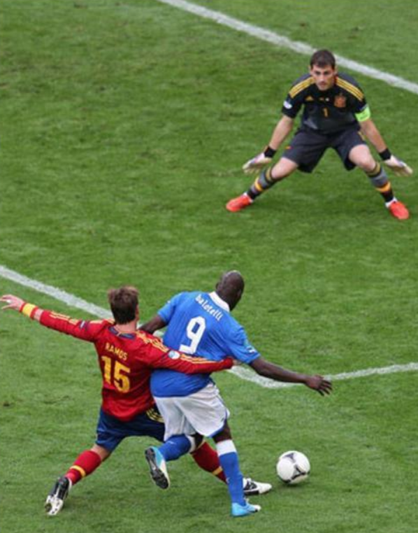 那是2012年欧洲杯西班牙与意大利的小组赛,第54分钟,拉莫斯回传失误被巴洛特利在抢断成功,随后巴神带球突入禁区,却在小禁区前沿突然“中了邪”一样的放慢了速度,拉莫斯全力会追后铲断成功,巴神就这样错失单刀射门机会,这个神奇的行为,也被戏称为“思考人生”。