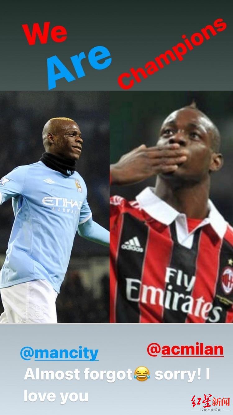 巴洛特利晒出了自己身穿曼城和米兰球衣的照片