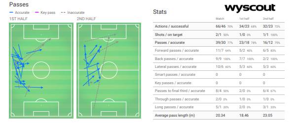 从Wyscout的技术统计上,我们还可以看到,科拉罗夫本场一共有39次传球,30次成功。其中给到进攻三区的传球数为8次,成功了4次;对角线转移球10次,成功6次。他的传球平均长度为20.34米,这也说明了科拉罗夫的传球相对线路较长,长传是他的特点之一。