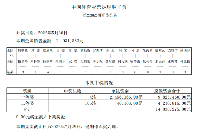 北京时间5月26日,足彩第22062期开奖结果揭晓。本期一等奖开出4注,单注奖金245万余元,二等奖开105注40,103元,任九802注15,553元。本期胜负彩销量为21,931,832元,任九投注总额19,490,810元。挪超克里斯蒂安松VS特罗姆瑟的比赛延期,比赛时间待定,本场比赛按照相关规定按310全对计算。