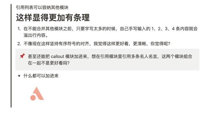 不同模块可以组合一直都是用户的念想,虽然标题模块和 Toggle 模块还不能组合,但引用模块和 callout 模块已经可以跟其他模块组合了,这让这两个模块类型变得更加实用,更加有条理性,唯一的缺点就是第一行必须是普通文本。