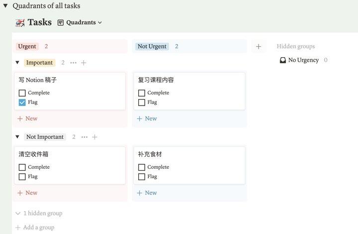 第一,当然是《Twitter》友人当即开发出来的四象限任务管理模板。首先,新建一个「看板视图」,然后添加「紧急程度」和「重要程度」的「Select Property」,接着将 Group 和 Sub-Group 分别以「紧急程度」和「重要程度」分组即可。