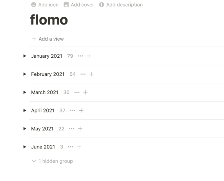 同时,你还可以结合分组功能,打造一个更符合你阅读或者创作需求的主页。如下图,你可以很方便地浏览每月生产的内容。而在《flomo》中,你只能按照标签浏览全量内容。因此,结合《flomo》和《Notion》,你多了很多维度去碰撞新思想。