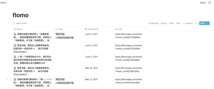目前为止,《flomo》会自动同步内容、创建日期、标签等 3 个属性,附件还需要等《Notion》支持。另外,在《flomo》中新增内容或者编辑现有内容都会自动同步,在《Notion》中增减内容则不会同步回《flomo》,这帮我们打造了一个很好的工作流:随时随地搜集碎片化灵感,毋需复制粘贴便可以在《Notion》整合并产出新内容。