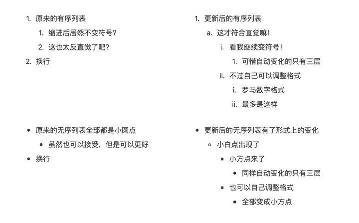 有序和无序列表同样也变得更加实用了。之前的列表模块没有层级,无论你缩进多少层,都是没有变化的,这很不符合我们直观视觉,尤其是有序列表,缩进之后还是显示「1., 2., 3.」。但现在有了明显的变化,不过如果你还是喜欢无变化的列表模块,则直接修改为某一个具体格式即可。