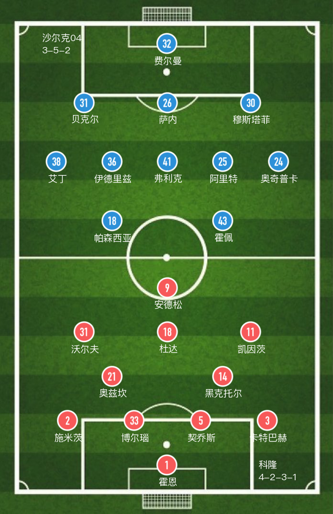 此役科隆使用了3-4-1-2的阵型。中场方面,赫克托提供的攻守转换值得期待。锋线方面特罗德·西蒙和比当古出任箭头。另一方面,沙尔克排出了3-4-3的阵型。格雷茨卡和Weston·James·Earl·McKennie组成的中场需要为锋线提供有力支持。奥奇普卡和科诺普良卡搭档左路,颇具威胁。恩博洛,迪桑托和科诺普良卡出现在攻击位。