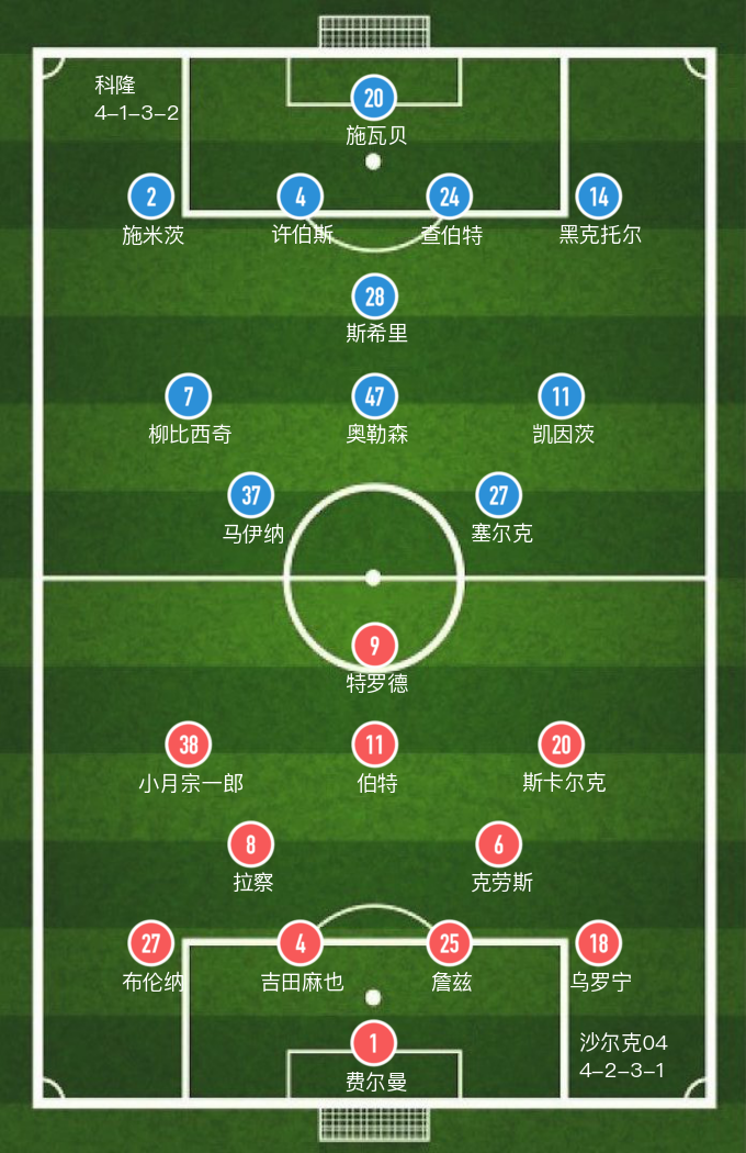 科隆(4-1-3-2): 20-施瓦贝,2-施米茨,4-许伯斯,24-查伯特,14-黑克托尔(46' 17-申德勒),28-斯希里,7-柳比西奇(78' 29-蒂勒曼),47-奥勒森(60' 23-阿达米扬),11-凯因茨,37-马伊纳(60' 6-马特尔),27-塞尔克(46' 21-蒂格斯)
