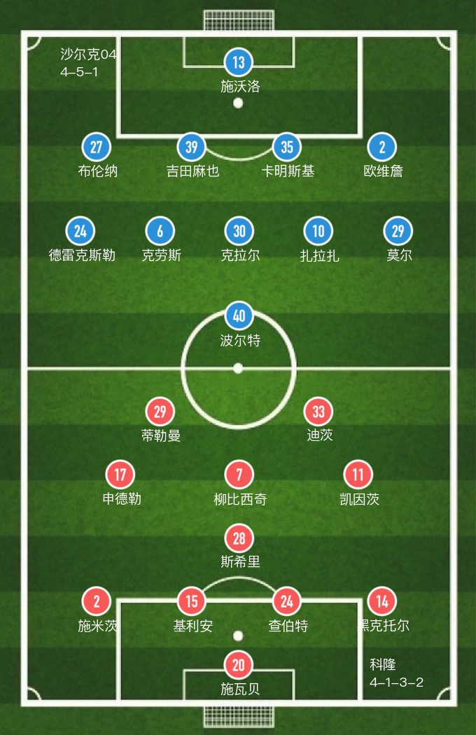 沙尔克04(4-5-1): 13-施沃洛,27-布伦纳,39-吉田麻也,35-卡明斯基,2-欧维詹,24-德雷克斯勒,6-克劳斯(78' 26-拉察),30-克拉尔(89' 42-卡尔汉诺格鲁),10-扎拉扎(58' 11-伯特),29-莫尔(77' 17-弗利克),40-波尔特(88' 9-特罗德)