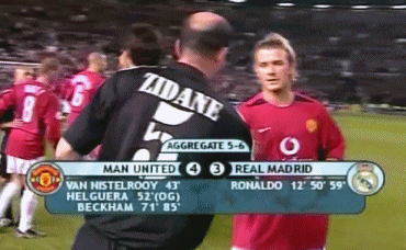 全场比赛结束,至此最终比分定格在了曼联4-3皇马,尽管曼联赢球,但总比分劣势让红魔遗憾淘汰。而赛后,双方阵中的两位中场大将,贝克汉姆和齐达内也交换了球衣,双方主帅弗格森和博斯克也友好拥抱↓