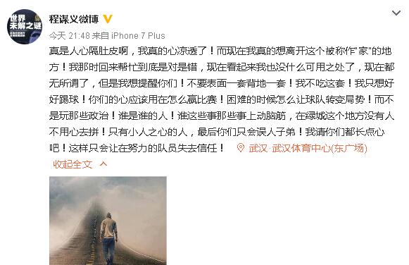 程谋义写道:“真是人心隔肚皮啊,我真的心凉透了!而现在我真的想离开这个被称作“家”的地方!我那时回来帮忙到底是对是错,现在看起来我也没什么可用之处了,现在都无所谓了,但是我想提醒你们!不要表面一套背地一套!我不吃这套!我只想好好踢球!你们的心应该用在怎么赢比赛!困难的时候怎么让球队转变局势!而不是玩那些政治!谁是谁的人!谁这些事那些事上动脑筋,在绿城这个地方没有人不用心去拼!只有小人之心的人,最后你们只会误人子弟!我请你们都长点心吧!这样只会让在努力的队员失去信任!”
