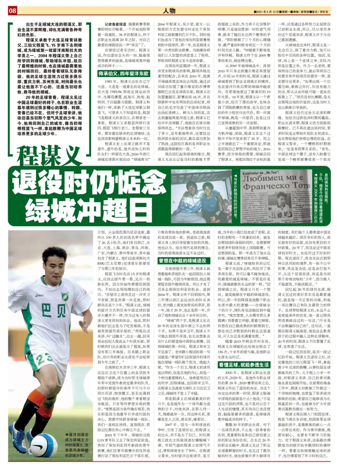 对于程谋义来说,职业生涯已经接近尾声,他渐渐地淡出了绿城球迷的关注圈。只是,我们偶尔会回想起20年前,绿城首批留洋的年轻面孔,然后想念这位陪伴了绿城足球十多年的"老男孩"。
