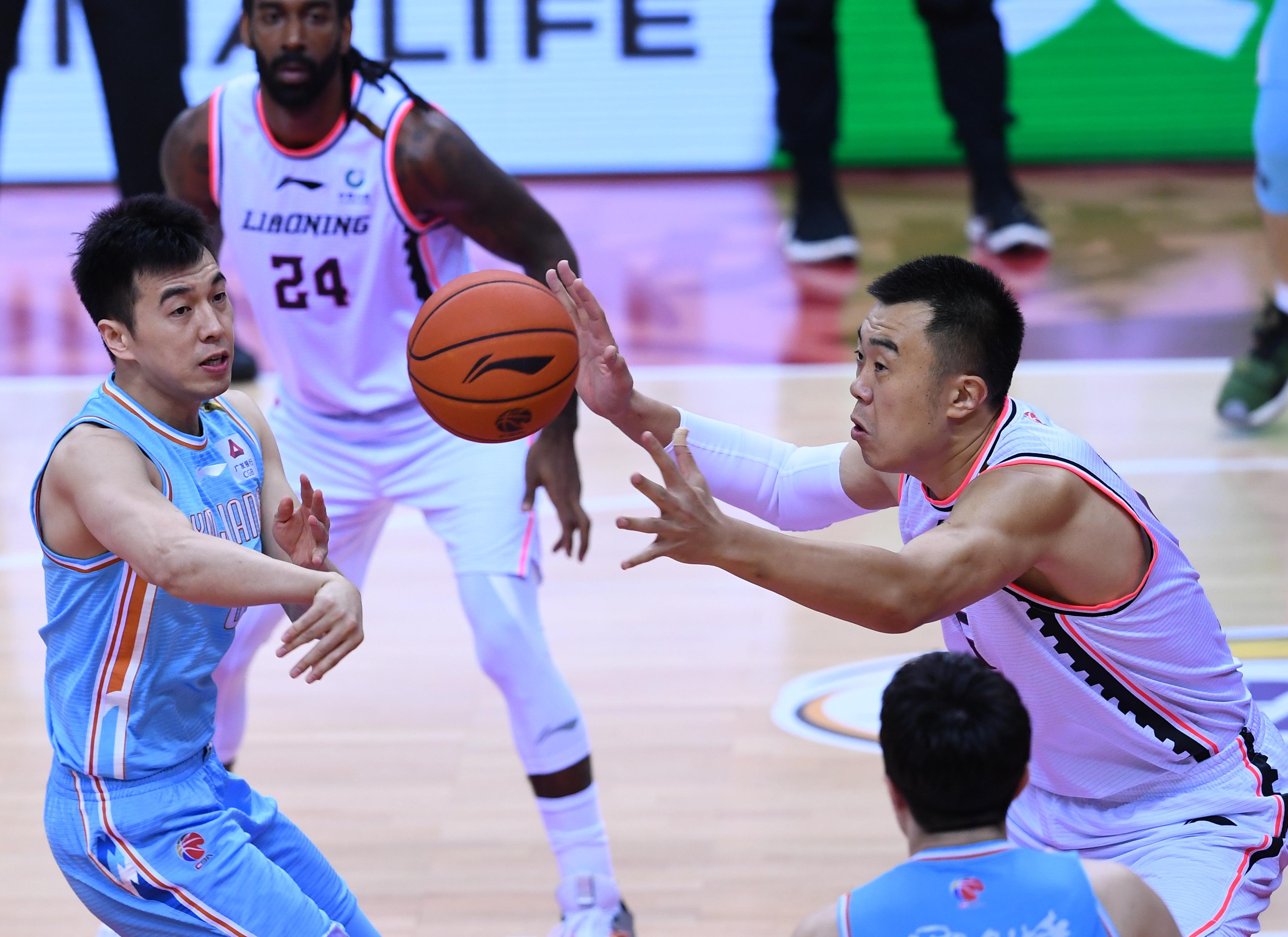 ↑辽宁本钢队球员赵继伟(左)在比赛中传球。新华社记者 雒圆 摄