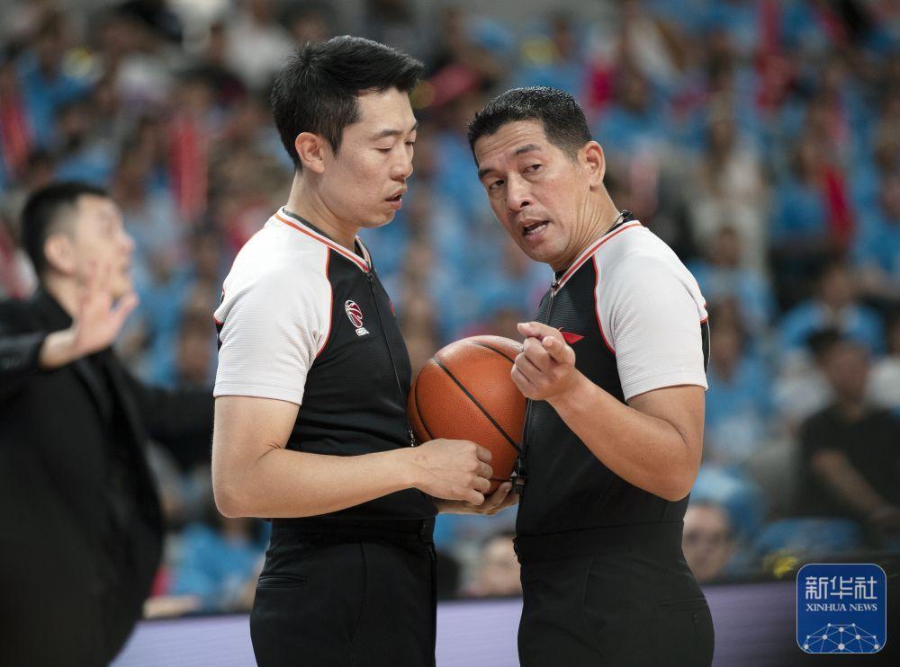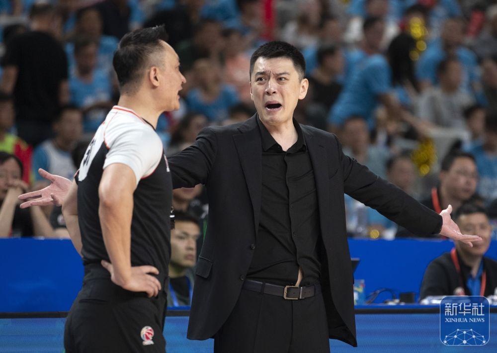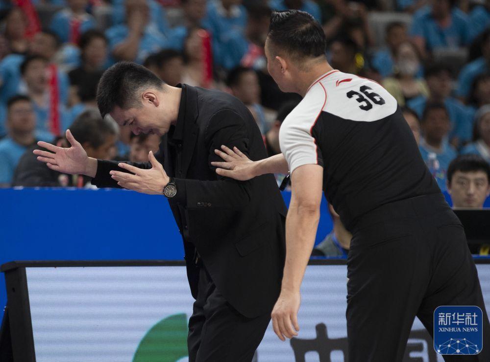 ↑辽宁本钢队主教练杨鸣(右)在比赛中和第一副裁判闫军交流。新华社记者 雒圆 摄