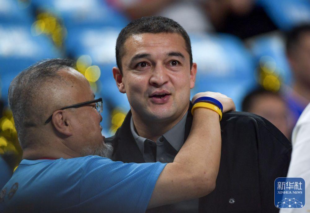 ↑南京头排苏酒队球员兼主教练、前新疆伊力特队球员西热力江(右)在比赛前与新疆球迷拥抱。新华社记者 王菲 摄
