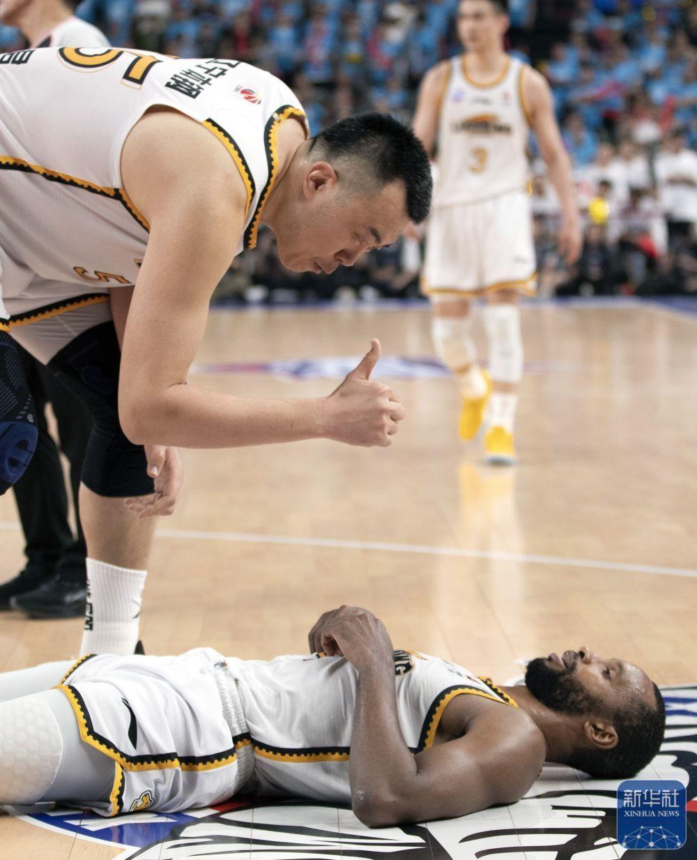 ↑辽宁本钢队球员韩德君(上)鼓励因拼抢倒地的队友弗格。新华社记者 雒圆 摄