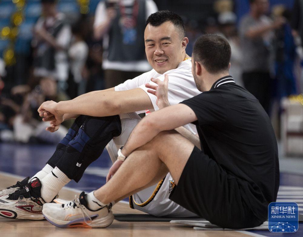 ↑辽宁本钢队球员韩德君(左)在比赛前。新华社记者 雒圆 摄
