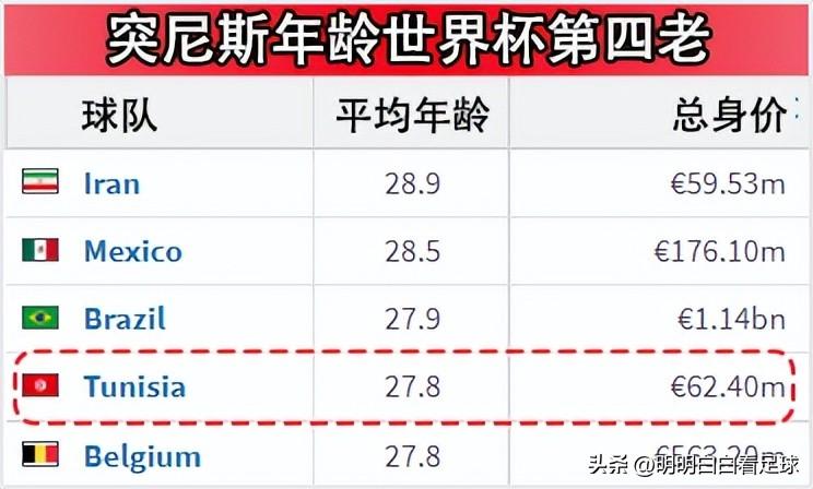 突尼斯平均年龄27.8岁,是本次世界杯第四老的,主力们更老。