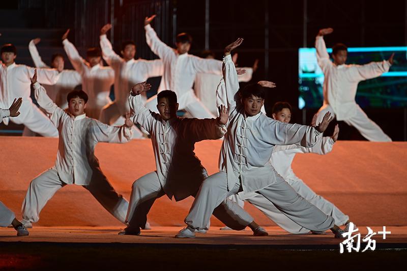 60位武术演员以黑白子的艺术形式展示武当太乙五行拳,配合上大屏幕的水墨江南,一股浓浓的中国风向观众袭来。
