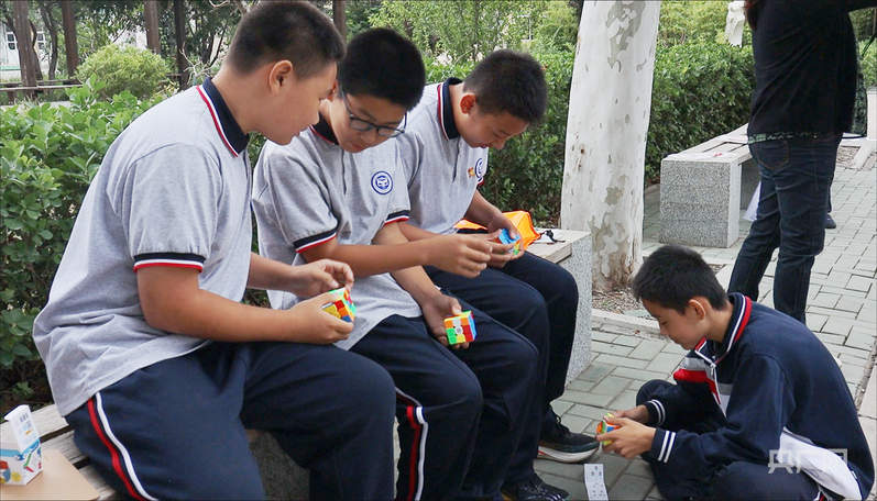 孩子们在课间玩魔方(央广网记者 庞婷 摄)