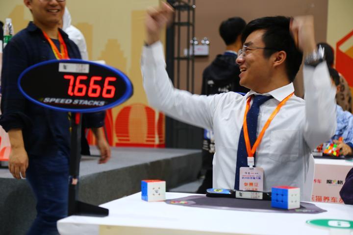 在本次比赛中,选手陈霖在三阶单手项目中以7.66秒冲破原亚洲纪录7.88秒。在冲破记录的那一刻,陈霖十分激动地举起了双手,并兴奋地站了起来。