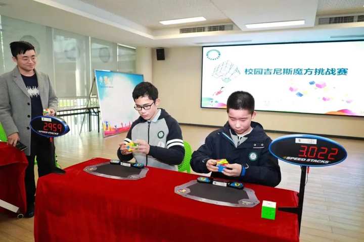 这是杭州观成教育集团的第七届校园吉尼斯魔方挑战赛,用的是我们最常见的三阶魔方。经过多轮PK,702班同学李立扬以11.25秒的成绩打破校记录。