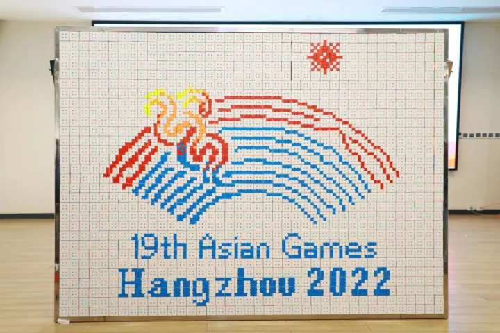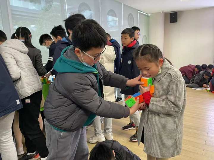 今天挑战赛结束后,紧跟着举行的是“筑梦亚运,魔力绽放”活动。在许同学的带领下,观成教育集团学校以及周边小学(长江实验学校、现代实验小学、长寿桥小学)魔方爱好者们,用1200个魔方,用时1小时拼成杭州2022年亚运会的会徽。