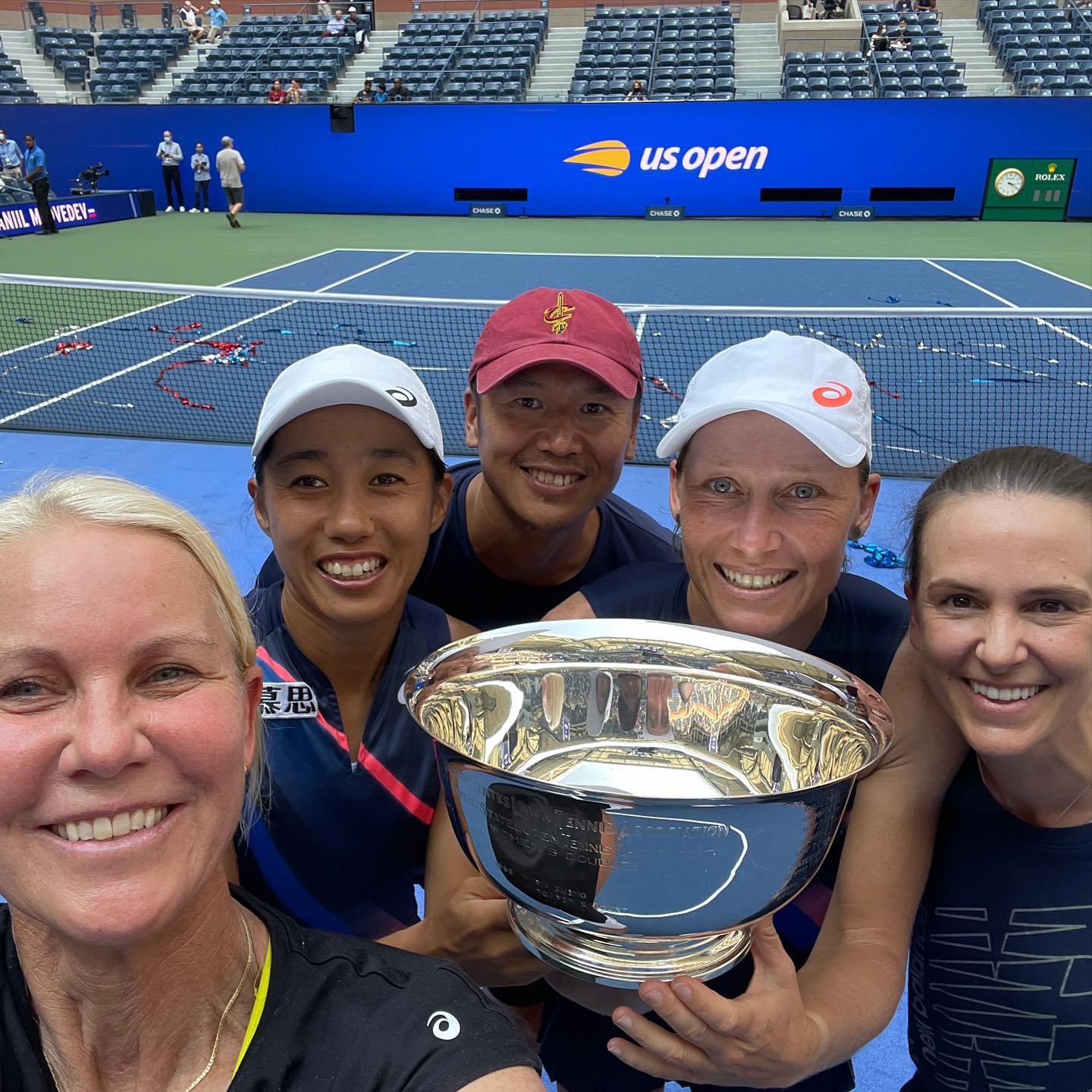 2021年美网女双决赛,张帅(左二)搭档斯托瑟(右二)夺得冠军,两人和团队成员一起展示获颁的奖品