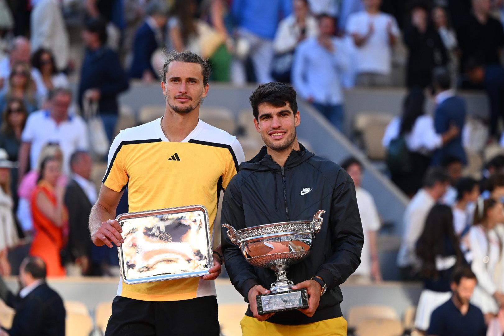 今年法网男单决赛,冠军阿尔卡拉斯(右)捧着奖杯,亚军兹维列夫(左)拿着奖盘