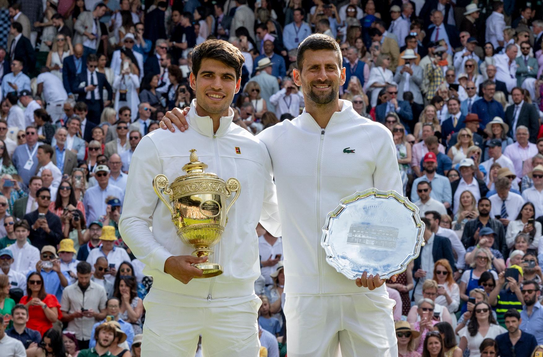 今年温网男单决赛,冠军阿尔卡拉斯(左)捧着奖杯,亚军德约科维奇(右)拿着奖盘