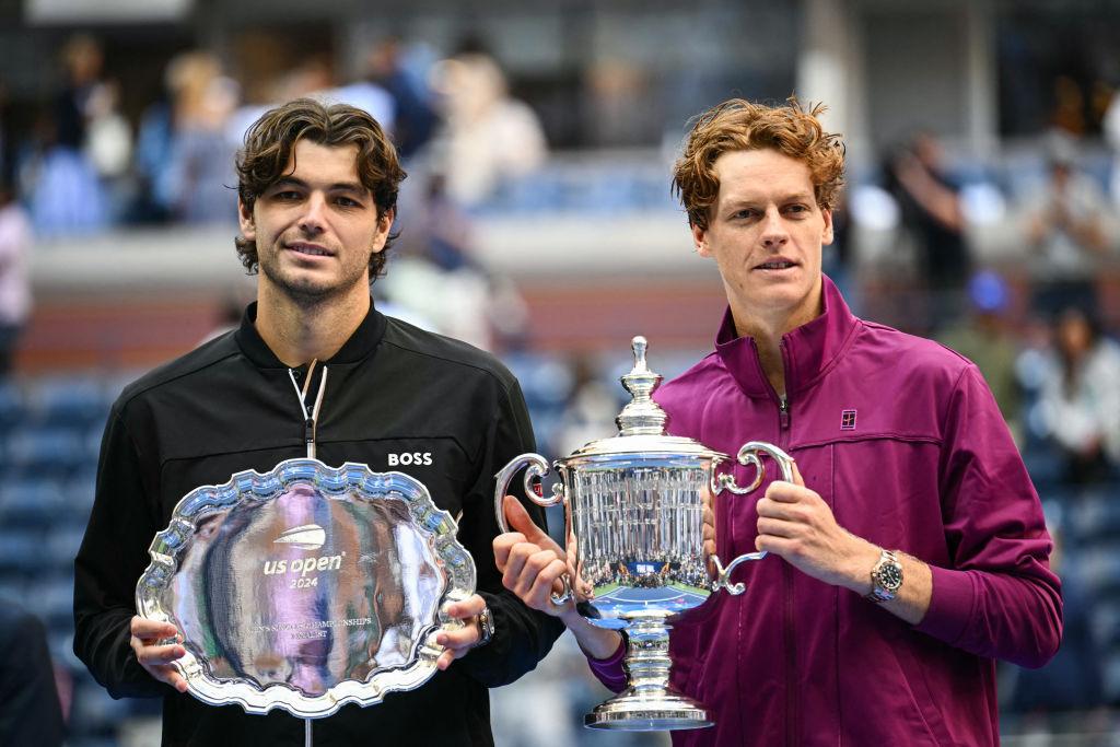 今年美网男单决赛,冠军辛纳(右)捧着奖杯,亚军弗里茨(左)拿着奖盘