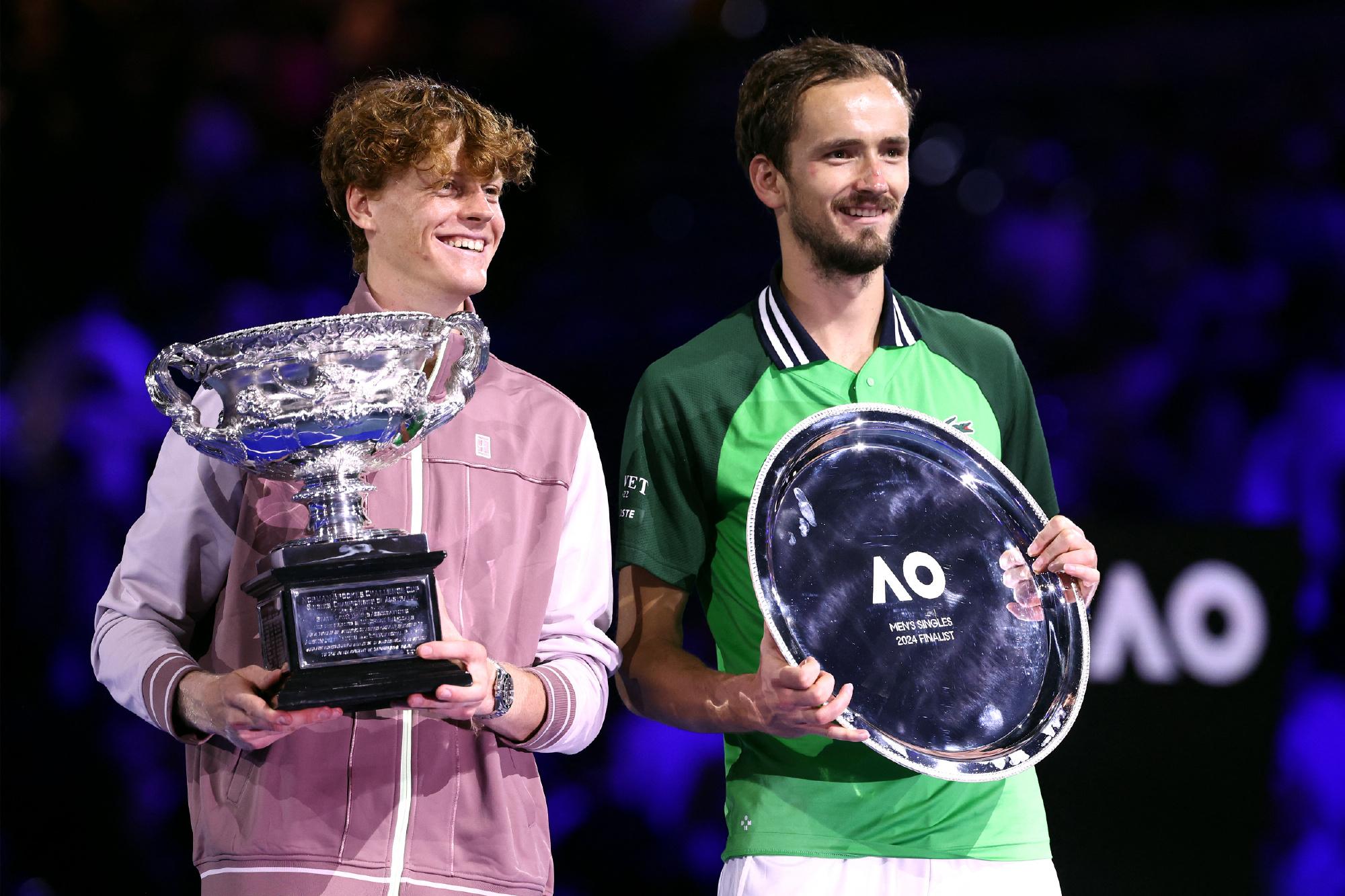 今年澳网男单决赛,冠军辛纳(左)捧着奖杯,亚军梅德维德夫(右)拿着奖盘