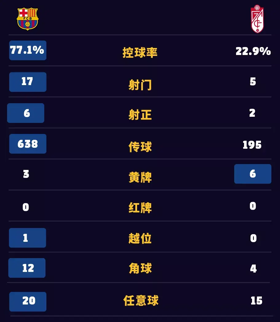 比赛第2分钟,格拉纳达利用角球,由杜阿尔特头球破门,巴萨0-1格拉纳达。