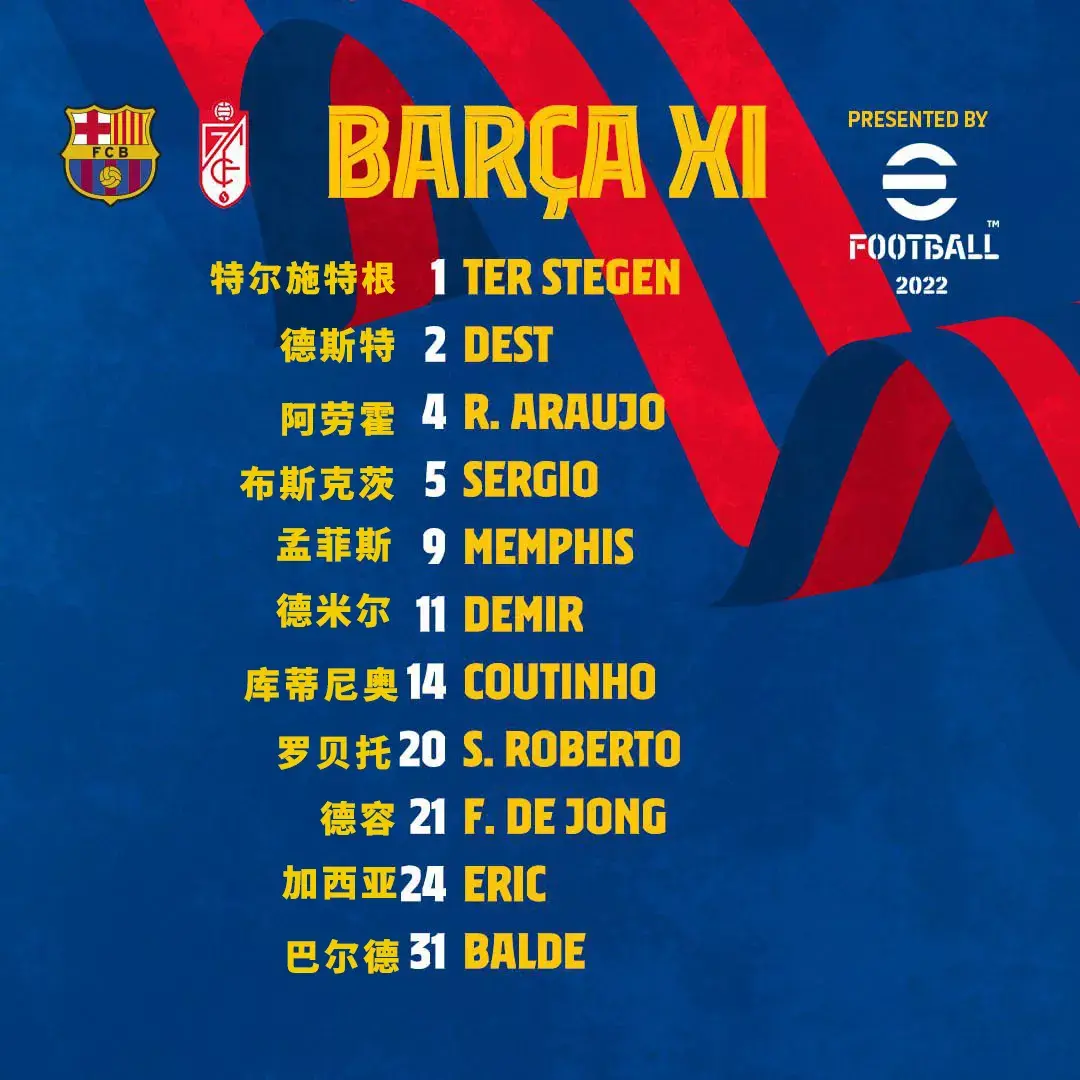 巴塞罗那首发:1-特尔施特根、18-阿尔巴、3-皮克、24-埃里克-加西亚(53'15-朗格莱)、8-阿尔维斯、5-布斯克茨、28-尼科-冈萨雷斯、30-加维、7-奥斯曼-登贝莱(81'34-阿尔瓦罗-桑斯)、29-胡特格拉(60'33-阿布德)、17-吕克-德容(60'9-德佩)