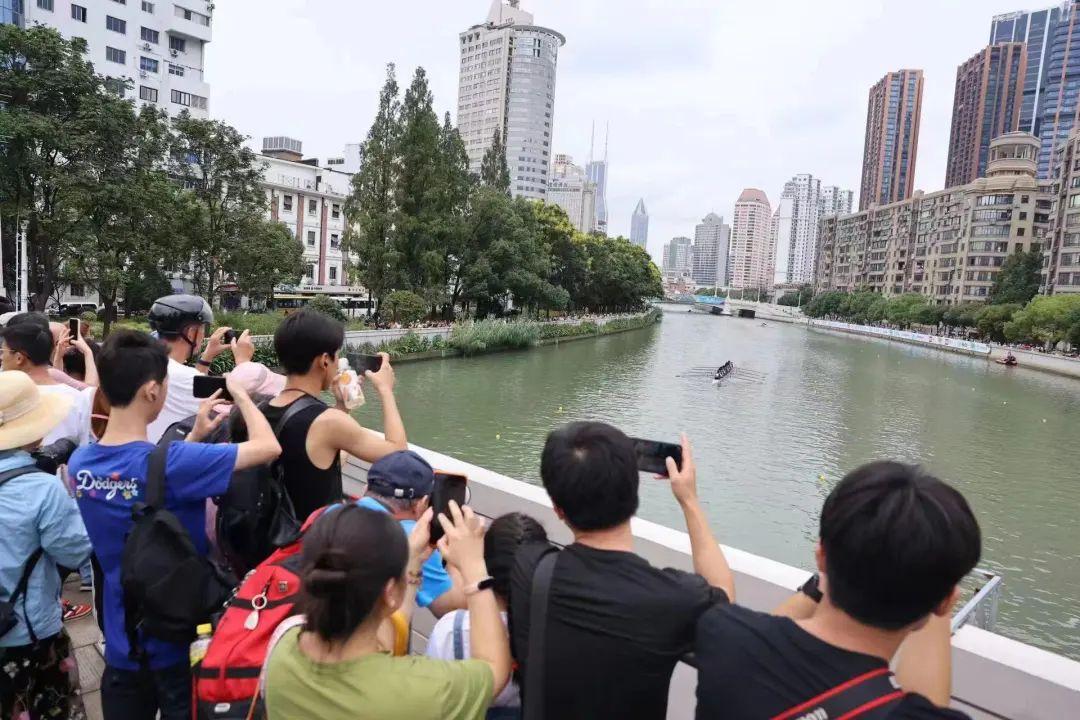 2022上海赛艇公开赛第二天,苏州河赛道上正举行着500米城市冲刺赛,充满了活力与激情。在北苏州路虹口段观赛区,观众们纷纷拿出手机相机打卡。现场直击过个瘾↓