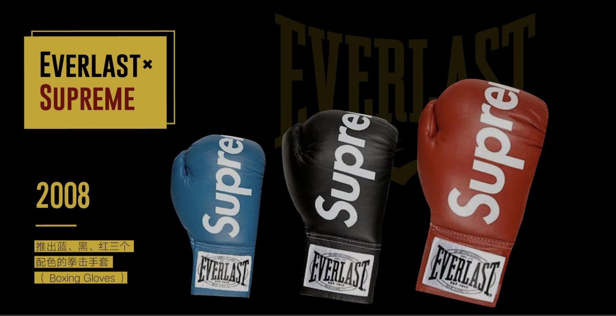 Everlast 与 Supreme 更是有着多次合作。两个品牌的合作最早可以追溯到2008年,推出蓝黑红三个颜色的拳击手套。2014年,两个品牌二度合作,推出一款跳绳和握力器。