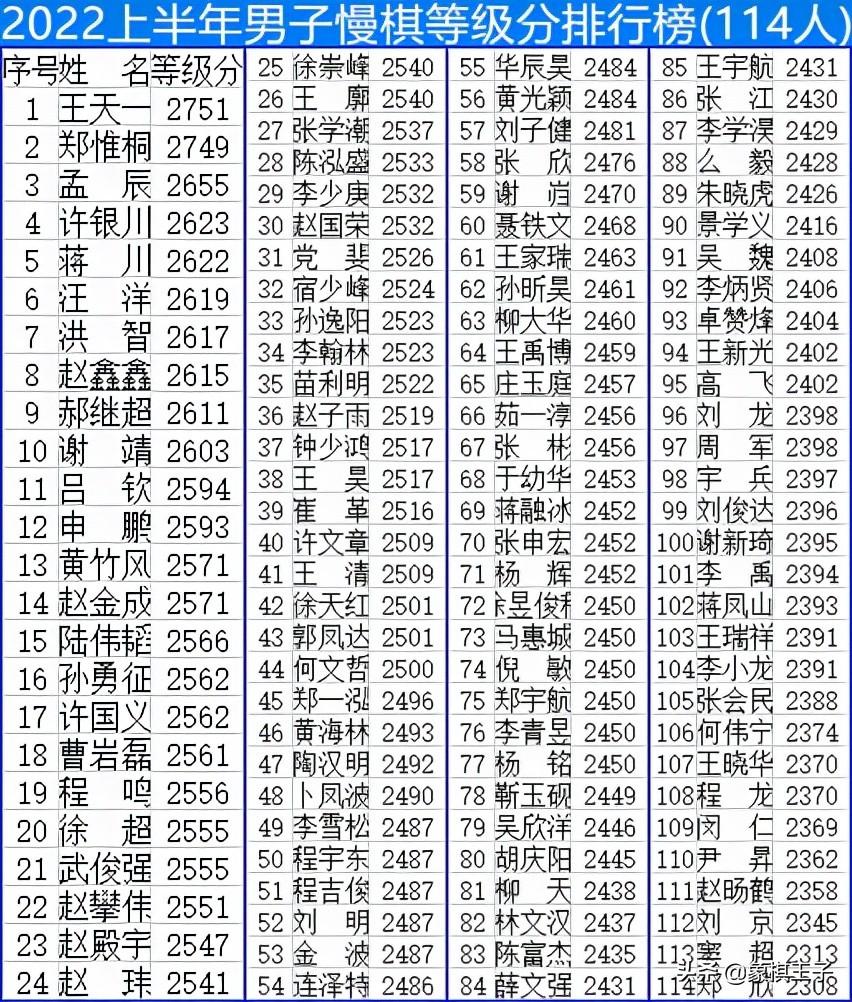 武俊强、赵攀伟、赵殿宇、赵玮、徐崇峰、王廓、张学潮、陈泓盛、李少庚、赵国荣、党斐、宿少峰、孙逸阳、李翰林、苗利明、赵子雨、钟少鸿、王昊、崔革、许文章、王清、徐天红、郭凤达、何文哲21-44名,此四十四将等级分在2500之上,郑一泓、黄海林、陶汉明等分列第45-114位,男子共一百四十四人上榜。