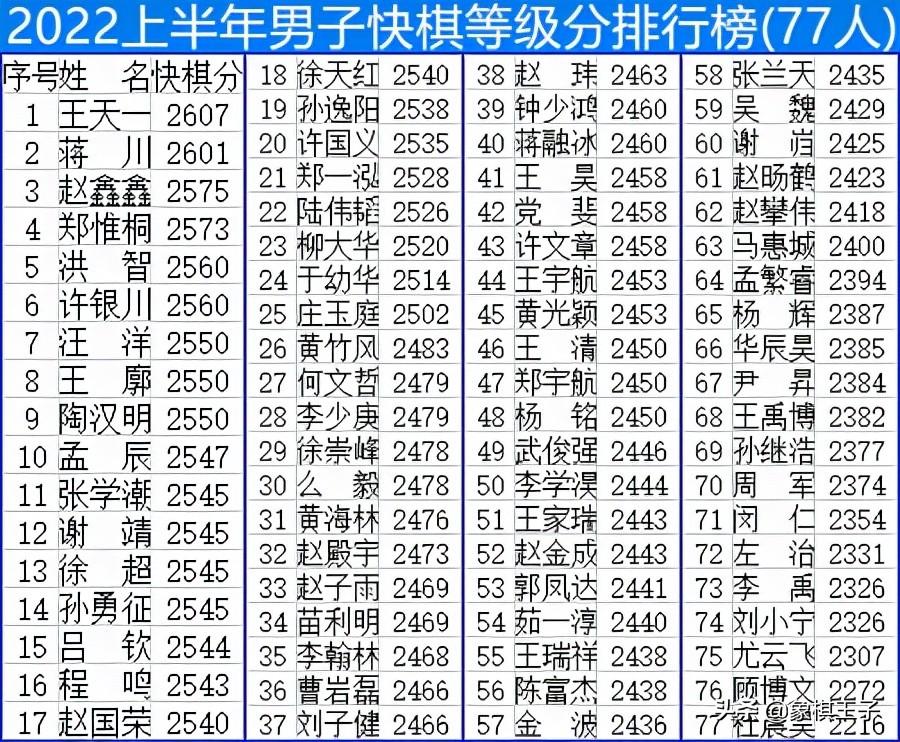 男子快棋等级分中,77将获得首批快棋等级分,第一同为王天一,2607,第二蒋川,2601,第三赵鑫鑫,2575,第四郑惟桐2573,第五洪智,2560,第六许银川,2560,汪洋、王廓、陶汉明、孟辰、张学潮、谢靖、徐超、孙勇征、吕钦、程鸣、赵国荣、徐天红、孙逸阳、许国义7-20名。