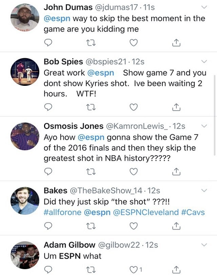 所以当ESPN重播2016年总决赛G7的时候,有不少没有办法出门的球迷们都在关注,不过这次ESPN的播出却引发了不小的争议,原来是在播出的时候居然没有欧文最后时刻的绝命三分球,反而詹姆斯的逆天超速封盖和两罚中一都有,这也让很多欧文的球迷们感到不满意,他们觉得自己的偶像是受到了侮辱,纷纷在社交媒体上表达着自己的情绪。