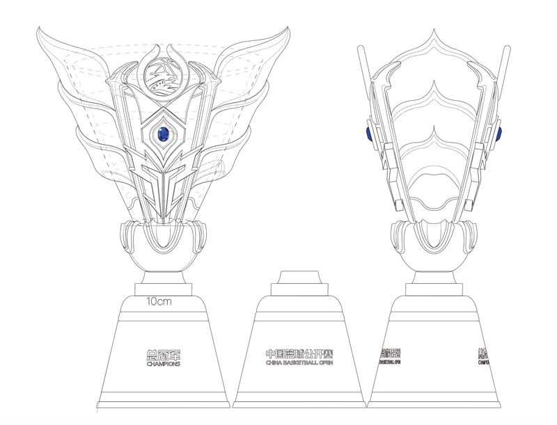 中国篮球公开赛冠军奖杯以中国龙为核心设计元素。龙爪抓住奖杯底座,两侧各展开的三片龙鳞,寓意着力量、勇气和协作。奖杯正面彩色宝石,与下方相对的两条抽象的龙呈现出二龙戏珠的形态,诠释了属于篮球的拼搏和友谊。位处正中的宝石,同时也是龙眼的位置,龙眼在上方俯视全场,确保比赛的公平公正,看向未来,寓意乘风破浪,一路向前。