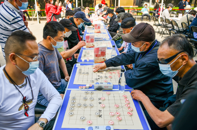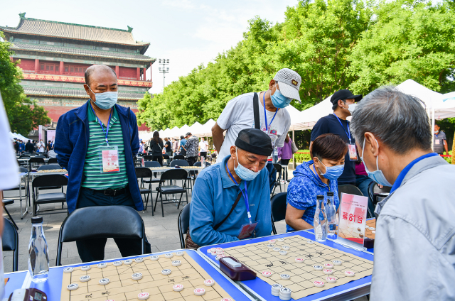 象棋是中华优秀文化的组成部分,而下象棋则是北京人最喜爱的休闲活动之一。上午八点,钟鼓楼文化广场,100张象棋对站台一字排开,参赛选手坐阵棋桌前,排兵布阵。选手中既有耄耋老人,也有中青年;既有东城区、安定门周边的胡同居民,也是从朝阳、大兴等地区赶来的象棋爱好者。比赛共分五轮,每轮限时16分钟,比赛开始,棋手们有的步步为营、有的严防死守,角逐十分激烈。