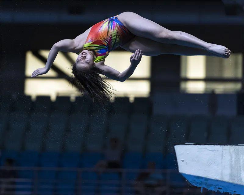 跳水项目中,运动员起跳前的表情,起跳前的规定预备动作、空中动作、入水瞬间、出水瞬间、泳池边冲水等待成绩的表情等,值得重点关注。拍摄运动员空中动作画面最好有跳台或跳板元素陪衬,有助于体现比赛项目的特征和照片的空间感,比赛的气氛感。拍跳水项目特别强调“快门启动永远在运动员动作之前”。