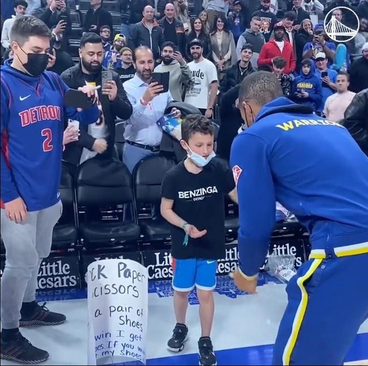 在比赛结束后,库里与场边一位举着“石头剪子布赢鞋子”纸板的小球迷进行了对阵。(纸板上写着:“如果我赢就获得你的球鞋,如果你赢就拿我的鞋子。”)在几番比划之后,库里赢得了胜利,他也高举双臂为自己欢呼。然后,他为小球迷在纸板上签了名,并与他合影留念。