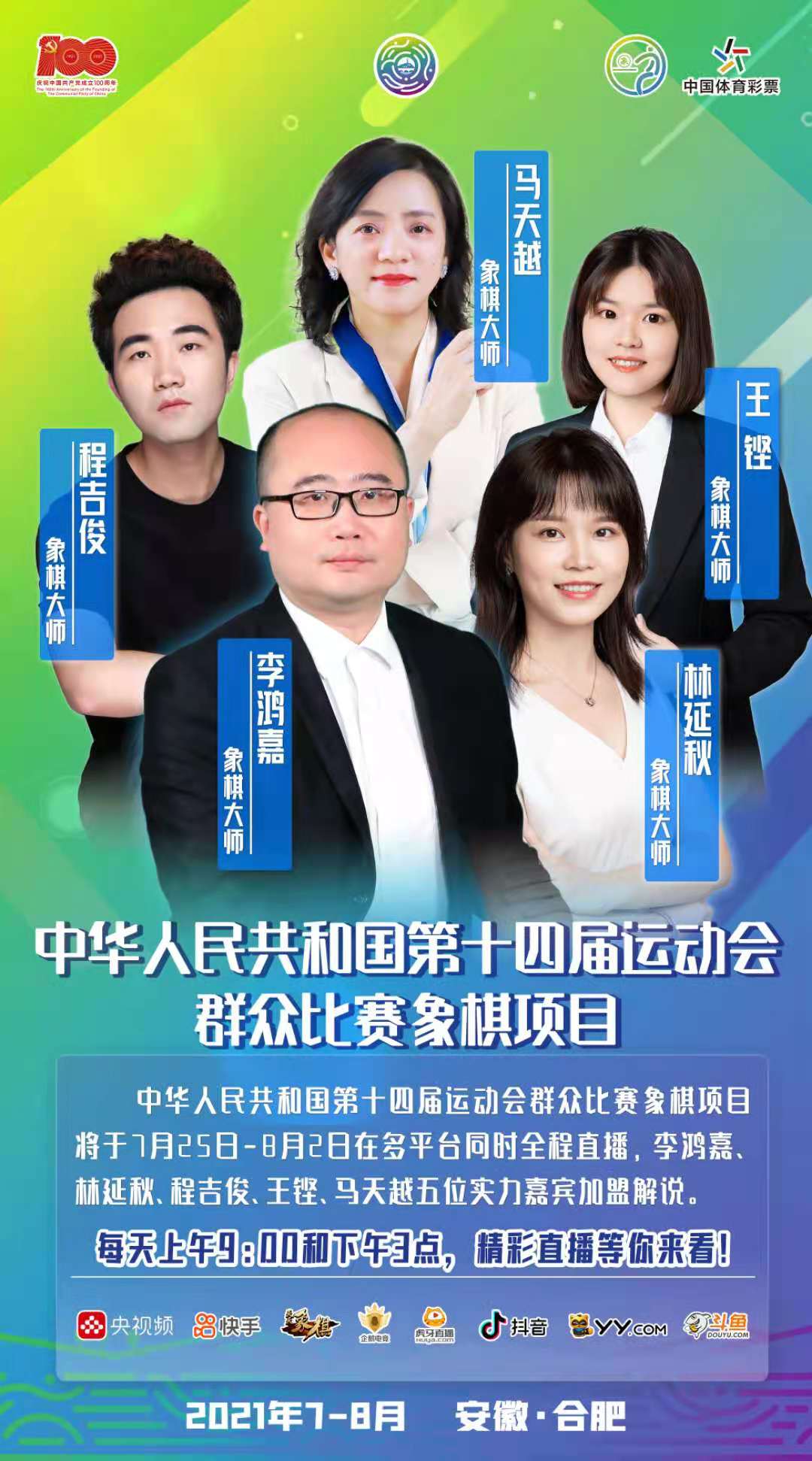 第十四届全运会群众比赛象棋项目将于7月25日至8月2日在安徽合肥举行。这是一届人人都能看的全运会象棋比赛——象棋项目在全运会历史上首次开通直播,将邀请李鸿嘉、林延秋、程吉俊、王铿、马天越五位象棋大师全程解说。