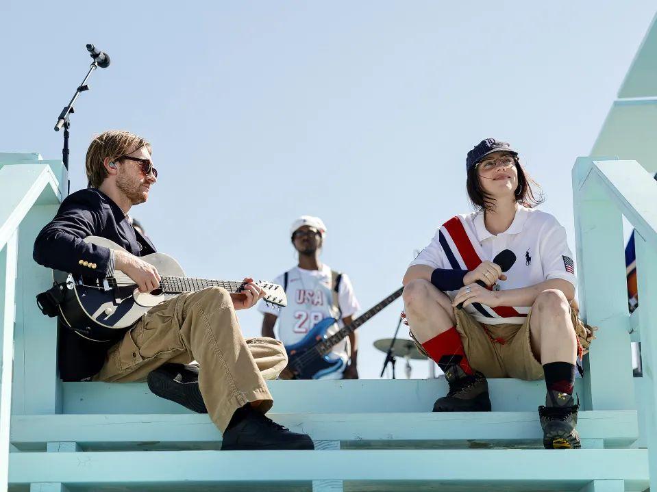 镜头切到了美国那边,同样是大家期待已久的Billie Eilish身穿Ralph Lauren马球衫,搭配一条银色的Chrome Hearts狗牌项链为造型锦上添花。她在哥哥芬尼亚斯的陪伴下演唱了最新热门歌曲《Birds of a Feather》。
