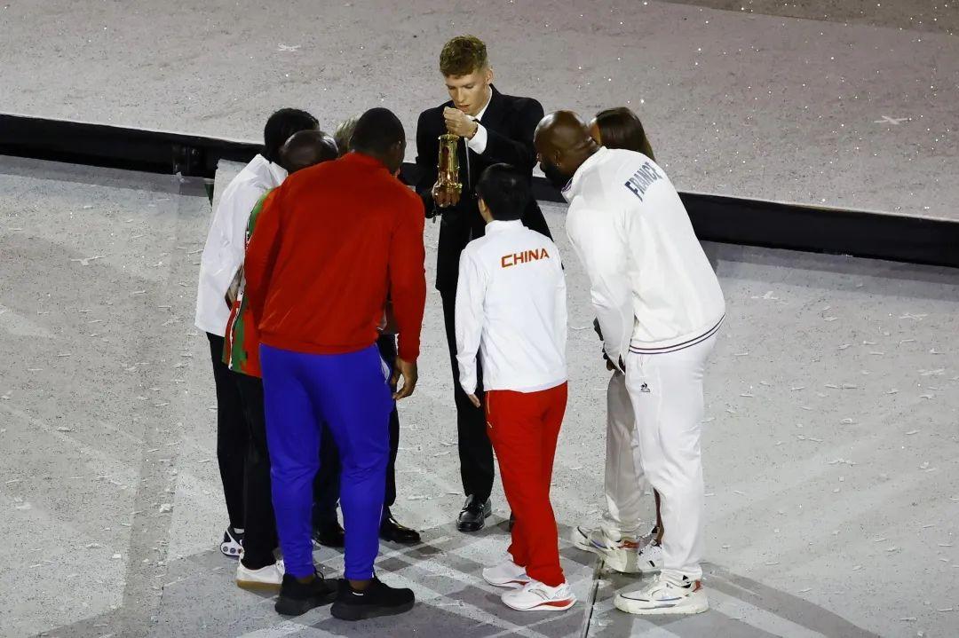 Louis Vuitton的品牌大使、游泳明星 Léon Marchand 随后从火炬塔上接过火炬,前往法兰西体育场。