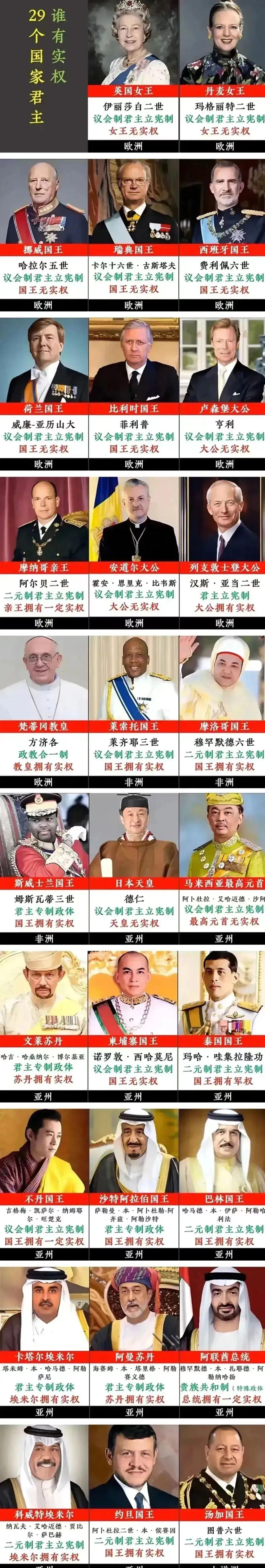 目前世界上还保留君主的国家,除了英国和日本之外,还有27个国家,其中14个国家实行君主立宪,这些国家大部分位于欧洲,属于比较传统的君主国。另外还有少部分保留着君主专制的“美好传统”,比如斯威士兰、沙特阿拉伯、梵蒂冈、卡塔尔、阿曼、文莱这6个,还属于“乾纲独断”时代。