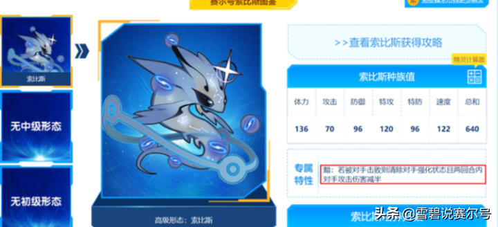 完克闪光艾斯菲亚的精灵,因为速度种族有100,起手肯定是要快过92的闪菲,开局直接强化特攻+2然后接150的大招,超能系精灵的死敌。当时我就练了一个,攻速255的索比拉特还是强,主要是因为它同后面出的罗德利斯一样,都是玩控场公式。