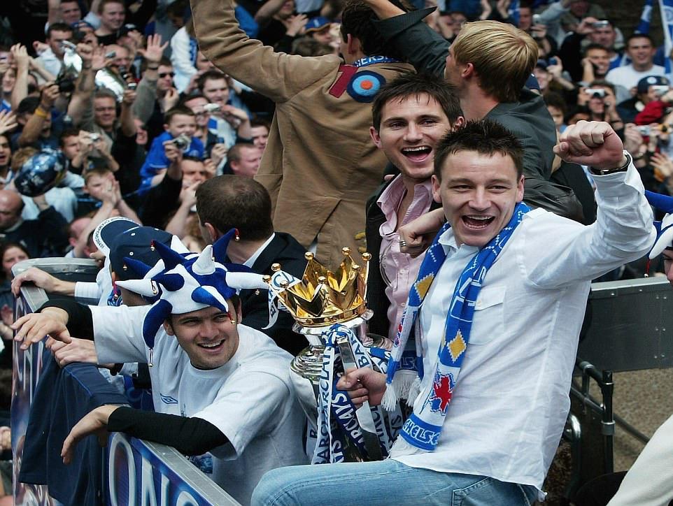 2005年:乔·科尔(左),弗兰克·兰巴德(中)和特里在新国王路参加活动,庆祝切尔西捧得首个英超冠军。在何塞·穆里尼奥带领下,特里防卫组织出色,切尔西在38场比赛中仅被踢进15球。